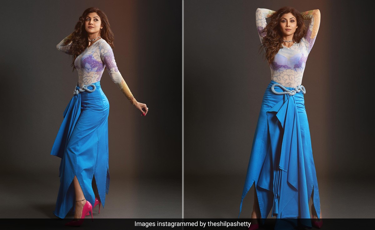 Shilpa Shetty'sartorial choices can be described as 'spectacular' in one word. Her vibrant outfits, cheerful prints, and bold selection are unmissable. The actress adds her personal touch to every outfit she wears and aces any look effortlessly. Her latest outfit she wore on her social media post was the perfect summer must-have. The actress wore a full-sleeved sheer top with a bodycon fit and paired it with a blue bralette beneath. Shilpa's choice of asymmetrical wrap skirt in a blue colour palette added coolness to her outfit. Adding a pop of colour to her dressing, Shilpa picked a pair of fuchsia pink pointed heels. A delicate beaded necklace, permed curls, and minimal makeup completed Shilpa's look.