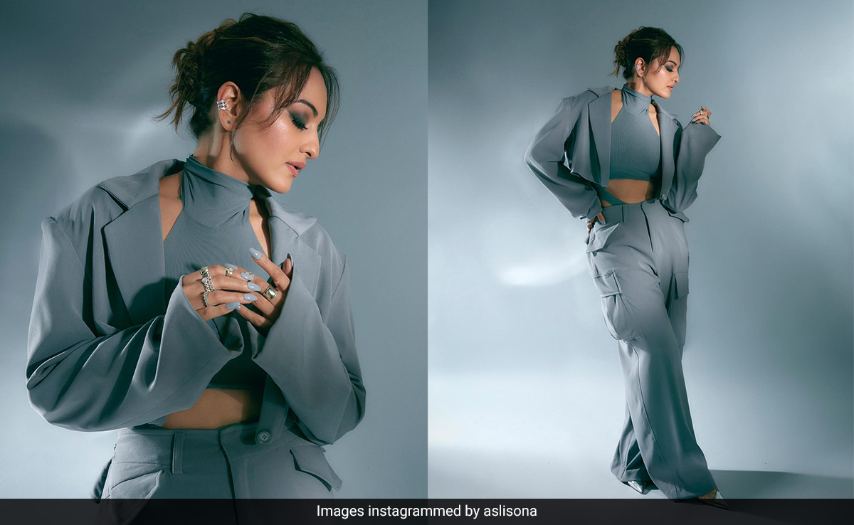 Sonakshi Sinha has unapologetic style that often reflects her personal aesthetic. She has never failed to serve us with an array of diverse silhouettes. Whether she is decked up for an event or heading to a B-town party, her signature style reflects her personality. The actress is at it again as she makes a case for monochrome in the most stunning co-ord set. She is absolutely "ready to roar" in a stunning dusty blue co-ord set that screamed sartorial power. She paired her halter neck cutout bodysuit with a cropped blazer and stylish cargo pants. What really added an edge to the look were her matching nails. What better way to make a statement this summer!