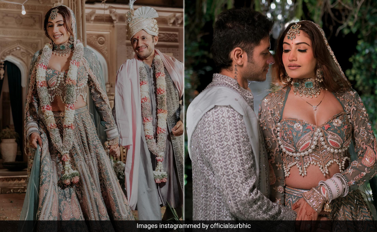 TV actress Surbhi Chandna married her longtime beau, entrepreneur Karan Sharma on Saturday, and their wedding was nothing short of a fairytale. The couple's choice of pastel outfits has set a new benchmark for modern-day wedding fashion. Surbhi looked absolutely radiant in a fully embellished lehenga choli set in soothing pastel mint and peach hues. Her lehenga skirt, adorned with intricate silver, white, and pink sequin work, was a sight to behold. She paired the skirt with a matching cropped choli featuring full sleeves and a deep sweetheart neckline. The scalloped hemline of the choli added a touch of flair to her ensemble. The beautiful intricate work on the lehenga added an extra edge to the look and the delicate pearl-like details perfectly matched the aesthetic. Draped delicately on her head was a net dupatta with embroidered borders. From the accessory aisle, Surbhi picked a stunning choker necklace, tikka, bangles, and earrings. The groom Karan Sharma looked dapper in a pastel blue kurta pajama, paired with a grey-hued sherwani jacket. The intricate embellishments on the jacket lent him a regal aura. A pre-tied turban added the perfect finishing touch to his ensemble.