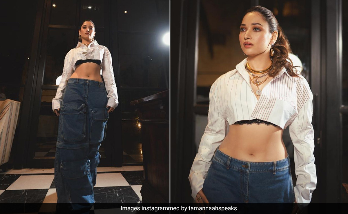 The temperature is soaring and Tamannaah Bhatia is making sure to add to it with her incredible fashion sensibilities. Summer staples have gotten her nod in an 'oh-so-chic' way. Summer styles go beyond the basics and Tamannaah is doing it fashionably right in a cropped shirt. Her choice of outfit from Off-White arrived in time for the season. She paired a super cropped white striped shirt with blue jeans. Is there a better classic fashion pairing than this? We don't think so. The black lacy bralette underneath added a stylish edge. With a stack of sleek yet statement gold necklaces and a pair of drop earrings, her accessories were truly on point.
