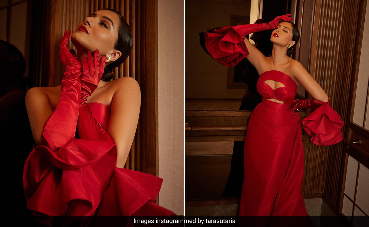 In the world of changing fashion trends, the elegance of gowns remains a timeless classic. Gowns have evolved over the years to fit into the fashion wardrobe of modern women. The latest to join the bandwagon is Tara Sutaria. The B-town diva has often turned heads with her on-fleek style statements. For her recent fashion outing, Tara Sutari made our hearts skip a beat in an elegant red couture gown, from the shelves of designer Lena Erziak. Indeed, she looked like an embodiment of a 15th-century woman in the outfit. Tara Sutaria already confessed that “Art Deco, vintage jewels, and gloves” were her “kind of evenings”. She rightfully delved into the vintage-inspired moment during a photoshoot a magin azine. Tara exuded true Marilyn Monroe vibes in the red evening gown that featured a cut-out midriff and a same-hued strapless bralette underneath. She made quite the vision for sore eyes in the figure-grazing bodice that was tight around her waist. Her satin-silk ruffled gloves added a sensuous appeal to her archaic ensemble. She took the minimal route to notch up her look and teamed it up with small-studded gold earrings. She glammed it up in a shade of dark red lipstick, coupled with fluttery eyelashes, a touch of shimmery eyeshadow, and blushed cheeks with a hint of contour.