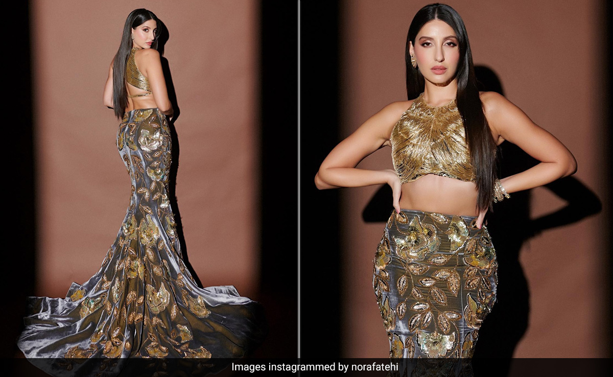 In the world of fashion, Nora Fatehi claims the throne as the undisputed queen. Mastering every attire, from sarees to sarongs, she always radiates style and elegance. Nora's recent appearance is no exception. She owned the spotlight by wearing a Manish Malhotra creation that gleamed like pure gold. Her gold-gilded embroidered crop top featured a daring cutout at the back and a sleeveless design that helped keep the drama quotient high. She paired the top with a custom mermaid skirt. The high-waist number struck the perfect balance between fit and flare. The grey velvet fabric was adorned with intricate gold floral embroidery. Nora's makeup team weaved their magic with pink lips, shimmery eyeshadow, mascara-laden lashes, and blushed cheeks. Gold earrings and bangles completed the star's accessories. Her poker-straight hair added a final stroke of perfection to this oh-so-gorgeous look.