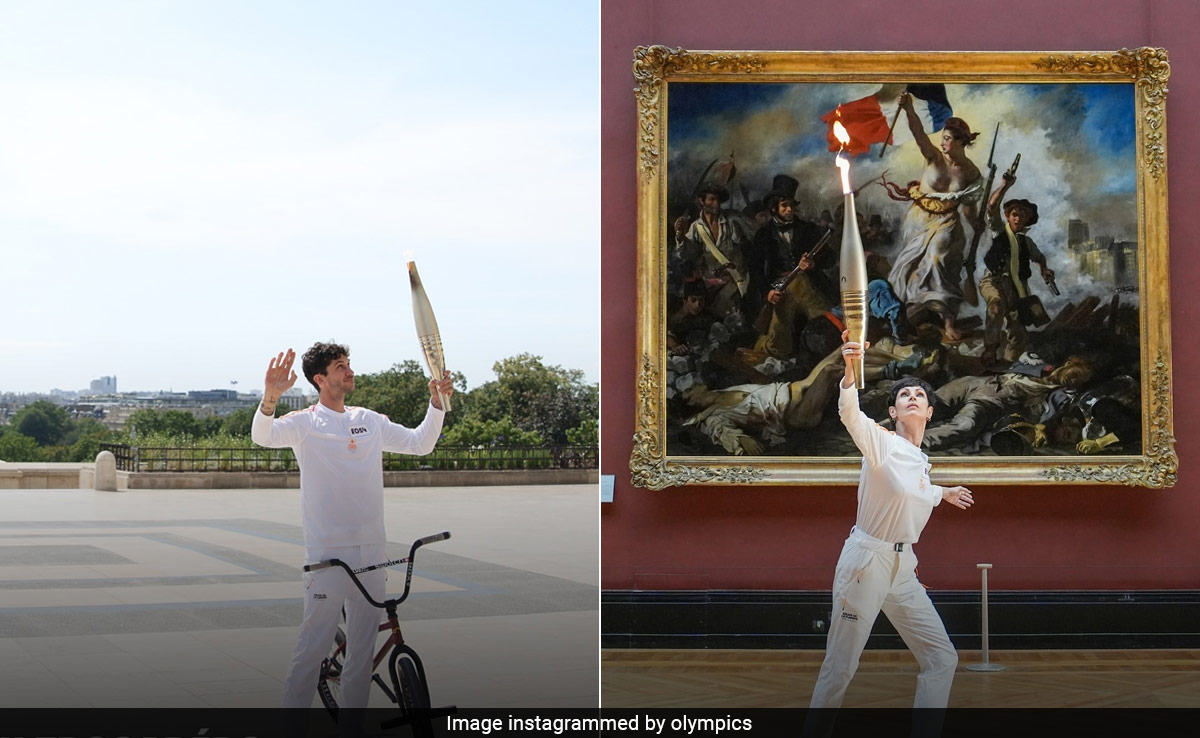 The 2024 Summer Olympics are set to kick off in France on July 26. Ahead of the international multi-sport event, an Olympic Torch Relay lit up the French capital on July 14 and 15. Many famous personalities became torchbearers, including BMX champion Matthias Dandois, a middle-distance runner from the Central African Republic Francky Mbotto, photographer and street artist JR, drag artist Minima Geste, and K-pop star Jin. Dressed in white, the representatives of art, culture, and gastronomy carried the Olympic flame to Paris' famous landmarks. From the iconic Eiffel Tower to the Moulin Rouge, Musee du Louvre, Arc de Triomphe, and Pyramide du Louvre, many prominent places were visited.