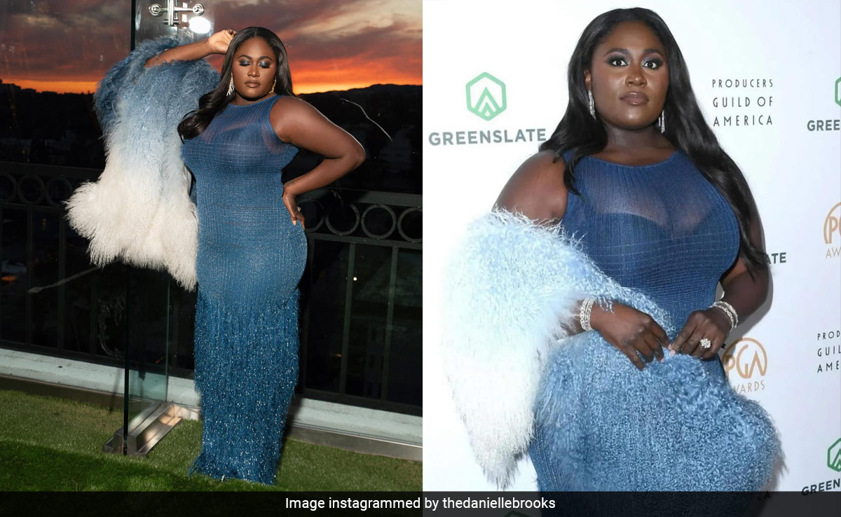 Danielle Brooks is an American actress famous not just for her stellar performances but also for her daring fashion choices. There is never a dull fashion moment with the diva who keeps it cheerful and vibrant with her stunning wardrobe. This time, she amazed her fans with a bodycon number from designer Prabal Gurung. The actress wore a shimmery midnight blue dress to keep it trendy. The exquisite, blue-toned sleeveless number came with a body-hugging silhouette, sheer detailing at the neckline and shimmery details to follow. It even featured fringe detailing at the hemline. What added a dramatic edge to the monochrome look was the two-toned fur coat that the actress carried with the gown. Danielle's glam makeup included shimmery eyelids, kohl-laden smokey eyes, highlighted cheeks and a pink lip gloss. For accessories, the star opted for dangling earrings, studded bangles and a statement ring.