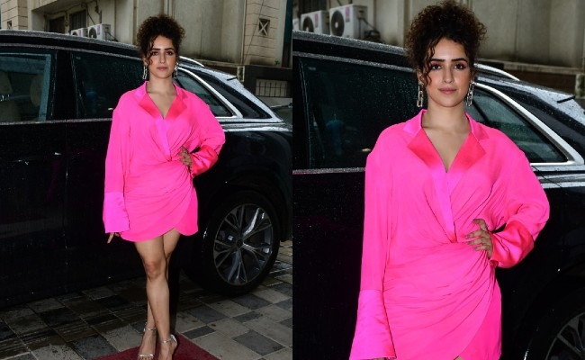 We thought today was set to be all grey and gloomy but one person turned that around for us completely. It happened to be none other than Sanya Malhotra. It may have been a particularly rainy day in Mumbai but the Bollywood actress is all business. To promote her upcoming movie Hit - The First Case, Sanya in a fabulously bright ensemble made for an ideal contrast with the dreary Mumbai skies. She chose a bright pink set of co-ords by designer Monisha Jaising.