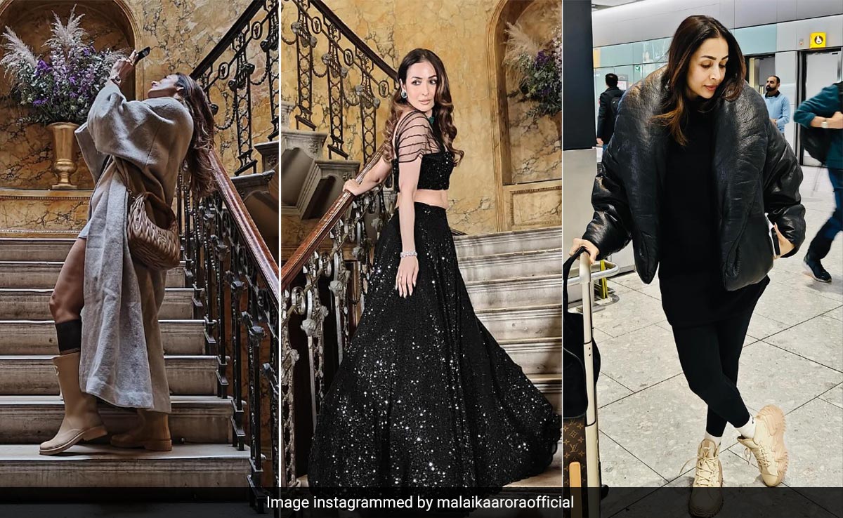 Malaika Arora's travel diaries never fail to impress us. Whether she's taking a short getaway or embarking on a long vacation, she always shares sneak peeks of her travel adventures with her social media family. Recently, the diva spent just 24 hours in London, yet she managed to give us a glimpse of what seemed like a luxurious workation. In the opening shot, Malaika is seen sipping a hot beverage from a cup. Another slide reveals a plate of her meal, featuring spaghetti, fries, a glass of wine and not to forget her Miu Miu handbag in the backdrop. A mirror selfie follows, showing Malaika in a white robe. Then, we catch a glimpse of the star in a stunning black Sawan Gandhi lehenga for Birdhichand's jewellery display. Additionally, she can be seen standing at the airport with her luggage in a frame. Captioning the post, Malaika wrote, "My 24 hrs in (UK flag)…… from gloomy weather to glorious jewels ( p.s. loving this song ).”