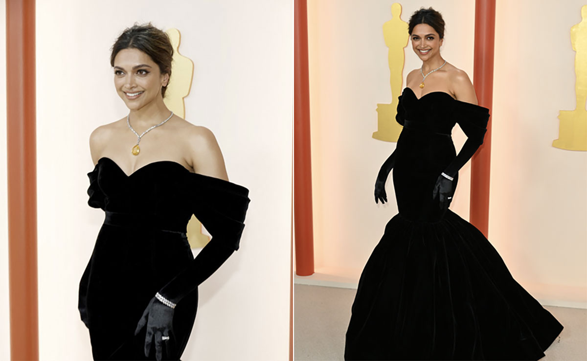 Deepika Padukone needs no introduction when it comes to fashion. As she climbs onwards and upwards up the fashion hill, she stops by to arrive in style at the Oscars' champagne carpet this year. With so much international recognition she has received in the recent past, her appearance at the Oscars was certainly not a shocking one. One of the most anticipated stars of the night Deepika Padukone exceeded all expectations in a charming black off-shoulder gown. She was invited to present the power-packed Naatu Naatu performance that very well deserved a standing ovation. Owing to her commitment as a brand ambassador to Louis Vuitton, it was only obvious that she would pick an ensemble from their shelves for the big night too. She brought old-world Hollywood charm back to the centre stage in a voluminous black velvet off-shoulder gown from the brand and paired matching black velvet gloves with it. The form-fitting bodice extends into a lavishly structured A-line bottom. She also endorses luxury jewellery house, Cartier and represented the brand's collection in the form of a drop yellow diamond necklace, stacked diamond bangles and rings over her gloves.