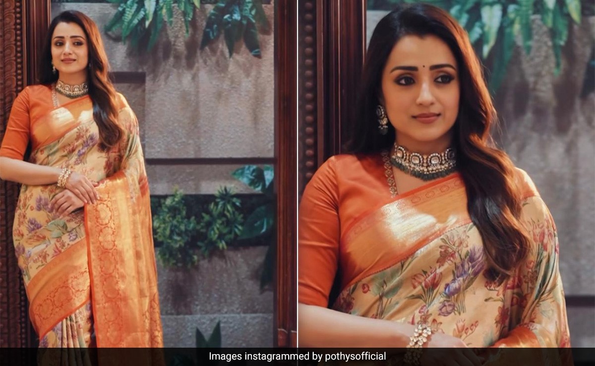 Every time Trisha Krishnan takes the ethnic route, she leaves her fans spellbound with her stunning choices. From embellished sarees to sequined ones, the actress has a wide range of gorgeous drapes to choose from. This time, the diva opted for a silk saree from the clothing brand House of Pothys. According to the brand's Instagram post, the printed Samudrika silk saree is an artistic masterpiece in Kancheepuram silk. The printed drape featured floral motifs in pastel shades of green, lilac, brown and more with a contrasting orange patti border featuring intricate meenakari zari weaves. The diva paired the saree with a plain, short-sleeved orange blouse with intricate gold zari work at the neckline. For accessories, Trisha picked a choker necklace with emerald green stones, a pair of bangles and dangling earrings. The actress left her tresses loose and opted for kohl-laden smokey eyes, ample mascara and pink lip colour.