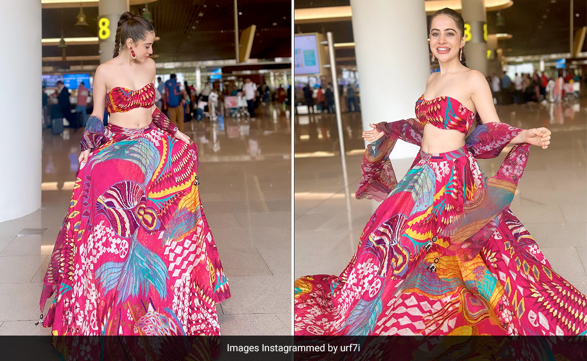 No one does experimental fashion better than Uorfi Javed. Her penchant for creating something offbeat is a given. From custom-making costumes to recreating iconic looks, Uorfi's style game has been stronger than ever. While she has always grabbed the fashion attention with her quirky looks, occasionally, her wardrobe does have designer standouts which she gives her spin to every now and then. Recently, she turned the airport into her personal runway when she brought a burst of colour in a beautiful Saaksha and Kinni lehenga. Soaking the Navratri fervour, Uorfi aced ethnic glam in the most contemporary way wearing this beautiful multicoloured number. Priced at Rs 44,000 on the official designer website, the number consisted of a strapless bralette blouse which Uorfi paired with a similar flared skirt. The flowy dupatta was all that she needed for that romantic flare. The ruby-toned statement studs beautifully matched the colour palette and her tresses tied in a high pigtail was the sophisticated element to complete her attire.