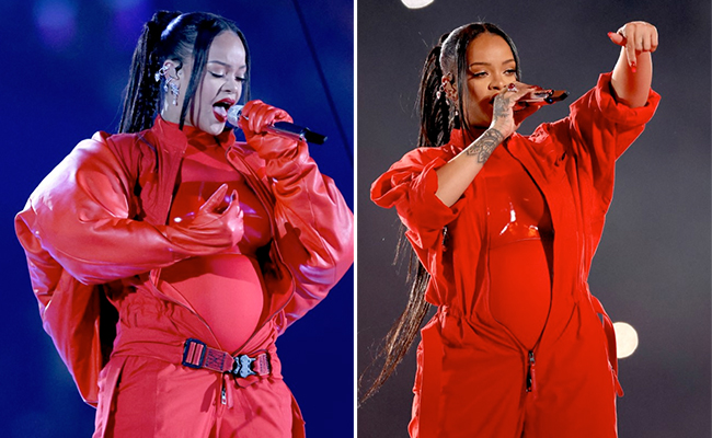 Fans have been anticipating the Super Bowl 2023 for a while and the reason for it was not the game at all, to begin with. Rihanna announced that she will be performing at the Super Bowl after what seemed like an eternity of having to witness her perform live. For Rihanna fans, it was nothing but a Rihanna concert interrupted by a football game. But we were not prepared for what was to come next. The Super Bowl halftime is where the magic takes place and as soon as Rihanna made her fiery entry to give not one but two reasons for her fans to rejoice. Rihanna is pregnant with baby number two and the singer in a red outfit gave it away when she cradled her baby bump at her aerial entry in true Beyonce style. At her triumphant return to the stage with a medley of her hit songs, Rihanna wore a layered red outfit from head to toe that included a red jumpsuit and glossy bustier from Loewe, diamonds from Messika and the MM6 Maison Margiela x Salomon Cross Drawstring High Top Sneakers. She also picked two custom Alaia coats, a puffer leather jacket and a floor-sweeping overcoat that included gloves for added effect. The classic makeup, a red lip, a red manicure and a high-top ponytail did have Rihanna red-y for her fans!
