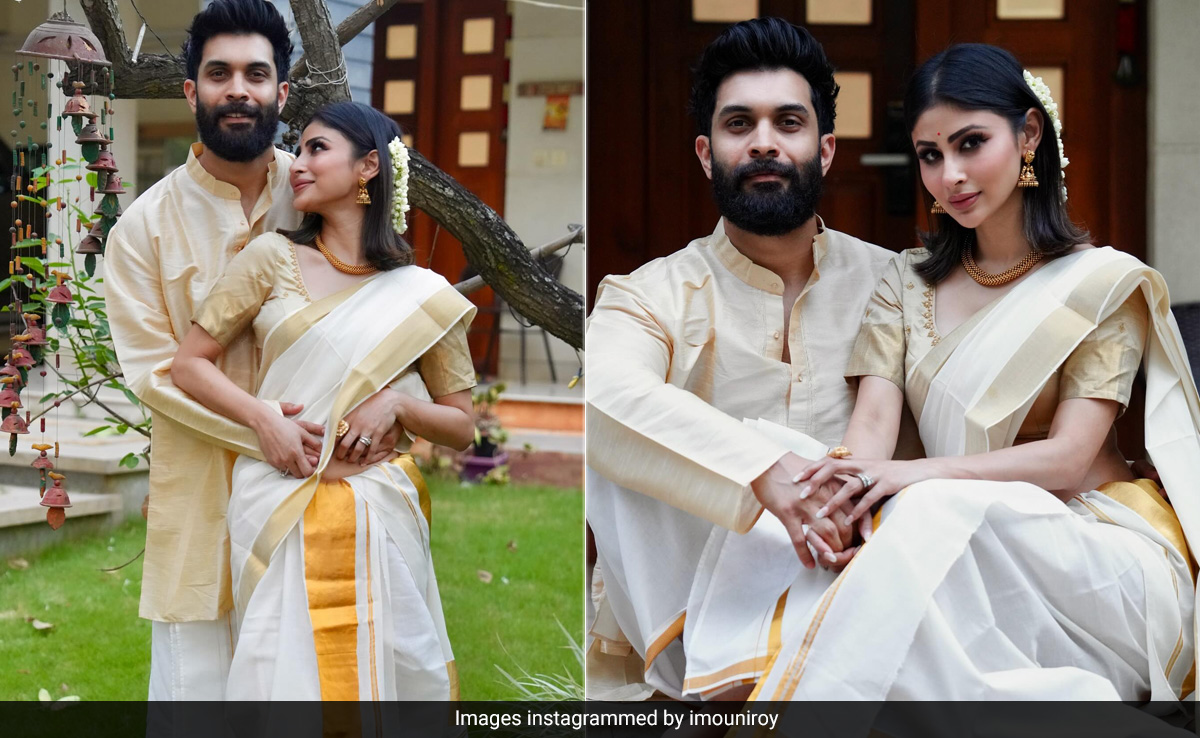 Mouni Roy's Indian looks are steeped in tradition and culture. Owing to her husband's Malayali heritage, the Mouni Roy was seen celebrating the Malayali New Year Vishu 2024 with his family, which coincided with the Bengali New Year Poila Baisakh this year. It was cause for a double celebration and a chance for the couple to look doubly chic. For the occasion, Mouni Roy stepped out in a traditional kasavu set. The white and gold saree set worked its charming effect. Worn with a gold blouse, Mouni looked as gorgeous as ever in her "Saree Girl Forever" vibe. She paired the saree with a gold temple jewellery set, flowers in her hair and her signature makeup style. Matching the gold and white was none other than her husband Suraj Nambiar in a dull gold kurta worn with a traditional mundu.