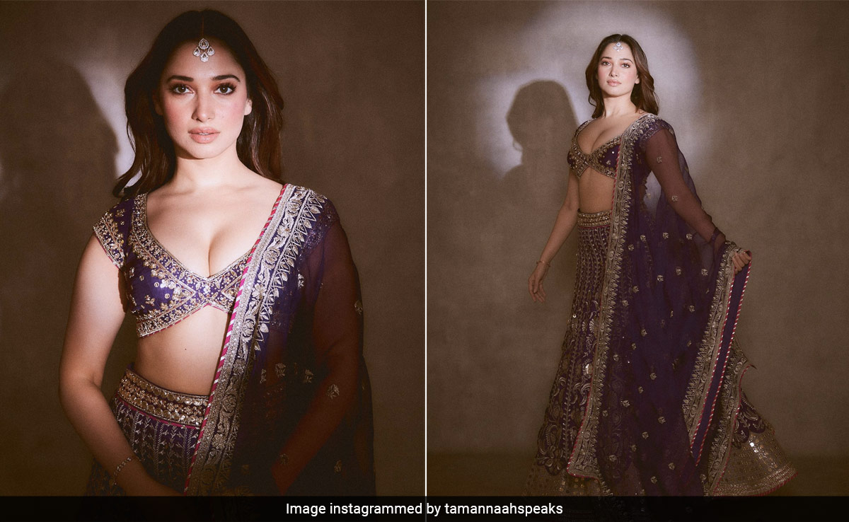 Tamannaah Bhatia does not just conquer the silver screen with each of her roles. Her fashion game is also worthy of praise. While she effortlessly slays in dresses and gowns, the diva's ethnic avatar is at a whole other level of Indian chic. And now by posting her recent Diwali look, Tamannaah has us all collectively picking up our dropped jaws. Wearing a regal purple lehenga set, the actress redefined glam with every twirl of her skirt. The heavy-duty lehenga skirt was adorned with golden sequin embellishments and sleek pink detailing along the hemline. The dainty blouse featured matching sequin work, a deep neckline and short sleeves. Adding a touch of ethereal grace, Tamannaah's semi-sheer dupatta with gold and pink borders elevated her ensemble to the next level. Going for the less-is-more mantra in accessories, she rocked a maang tikka, letting her outfit do all the talking. Soft curls framed her face, and the style icon's makeup was simple yet effective with glossy lips, mascara-laden lashes, arched brows, and rosy cheeks.