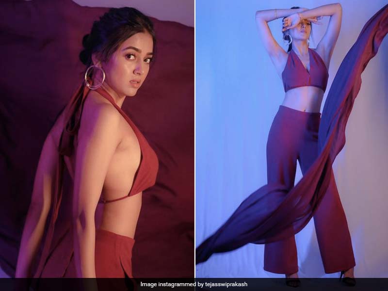 - Adding glamour to a monochromatic outfit is Tejasswi Prakash in a deep re