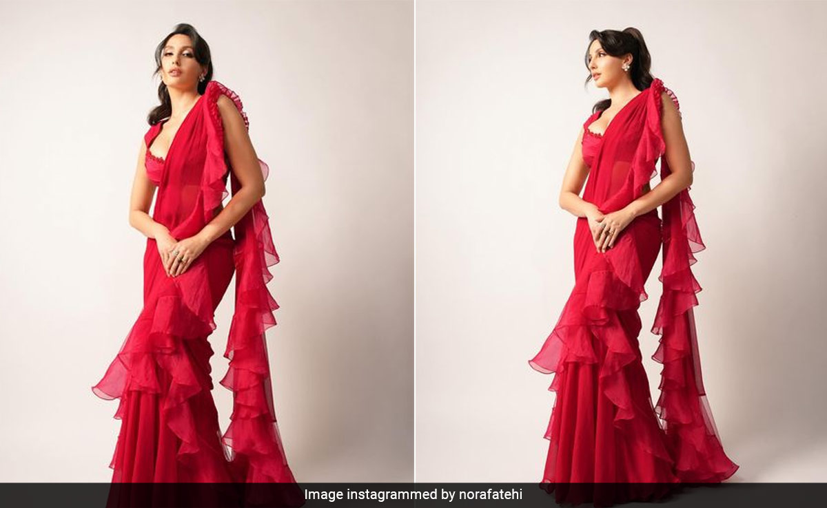 The beauty of red is unmatched. Cult classic hues are the mood of the moment and trust Nora to notch it up for you. Recently, she elevated the grace of red silhouettes in the most stunning way. From the shelves of Ridhi Mehra, she picked a beautiful drape that seemed to be a perfect choice for cocktail nights. Nora Fatehi has impressed the critics with her figure-enhancing silhouettes and now, it is her stunning red saree that stole the show. The chic ruffle details added all the drama to her look and the monochrome style balanced it out. She paired the appealing drape with a plunging neckline blouse that matched the clean aesthetic perfectly. For beauty, she went for a stylish ponytail paired with minimal glam. Her shimmery lids were balanced with matte nude lips to complete the look.