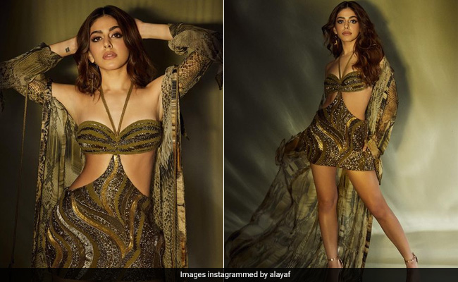 Alaya Furniturewalla's fashion game is always on point. She often makes appearances in chic stunning ensembles leaving us awestruck. Once, she shared pictures in a stylish olive-green outfit with various cutout designs and straps. The plunging neckline lent a bold twist to the ensemble. Alaya, with her signature minimal glam on, struck poses in the chic outfit.