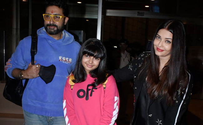 Aishwarya Rai Bachchan strikes a pose with husband Abhishek Bachchan and daughter Aaradhya Bachchan at the airport