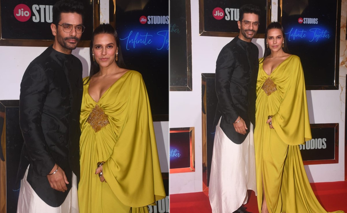 Honestly, Neha Dhupia doesn't need a special day or an occasion to dress up. She is a true diva. For a recent event, Neha stepped out in a satin kaftan-style gown. The mustard number was from the clothing brand Nour by Neharika. The gathered detailing and brooch finish patchwork added pizzazz to the look. Neha carried the deep neckline with utmost panache. The dramatic thigh-high slit added an extra edge. Neha went with a half-up hairstyle to round off the look. For makeup, the actress didn't go overboard with only a dewy touch. The nude colour on the lips suited her well. Neha added a subtle twist to her red carpet look with a pair of peach coloured pumps. Husband Angad Bedi complemented her by picking an Indo-Western outfit in black and white.