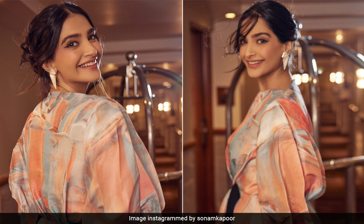 Sonam embodied a modern princess in a pastel, marble print, tie-dye midi dress from the shelves of clothing label Roksanda. Created from a flowy silk fabric, the outfit featured dramatic balloon sleeves and a cliched waist, secured from the sides with a black belt. We love how the attire bears a feminine and edgy touch. For accessories, Sonam chose to wear stone-encrusted, geometric-designed earrings and statement rings. She sided with a messy chic bun and left a few strands open to give a framework to her face.