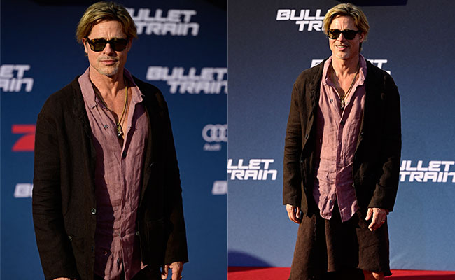 It seems like the movie promotions for Bullet Train is bringing out some very unique style statements from Hollywood. First there was Joey King in her edgy black pantsuit. Then there was Aaron Taylor-Johnson and Brian Tyree in monochrome neutral suits. So it was about time for Brad Pitt to get out there and make a fashion statement; which is exactly what he did. Now Brad Pitt is just a fabulous specimen of a man, as anyone with eyes will tell you. But his personal style has always been safe when he's on the red carpet. Brad in suits, tuxedos and shirts; we've seen them all. But a skirt? They say there's a first time for everything and so it seems that this was the first time for Brad Pitt to don a skirt on the red carpet.