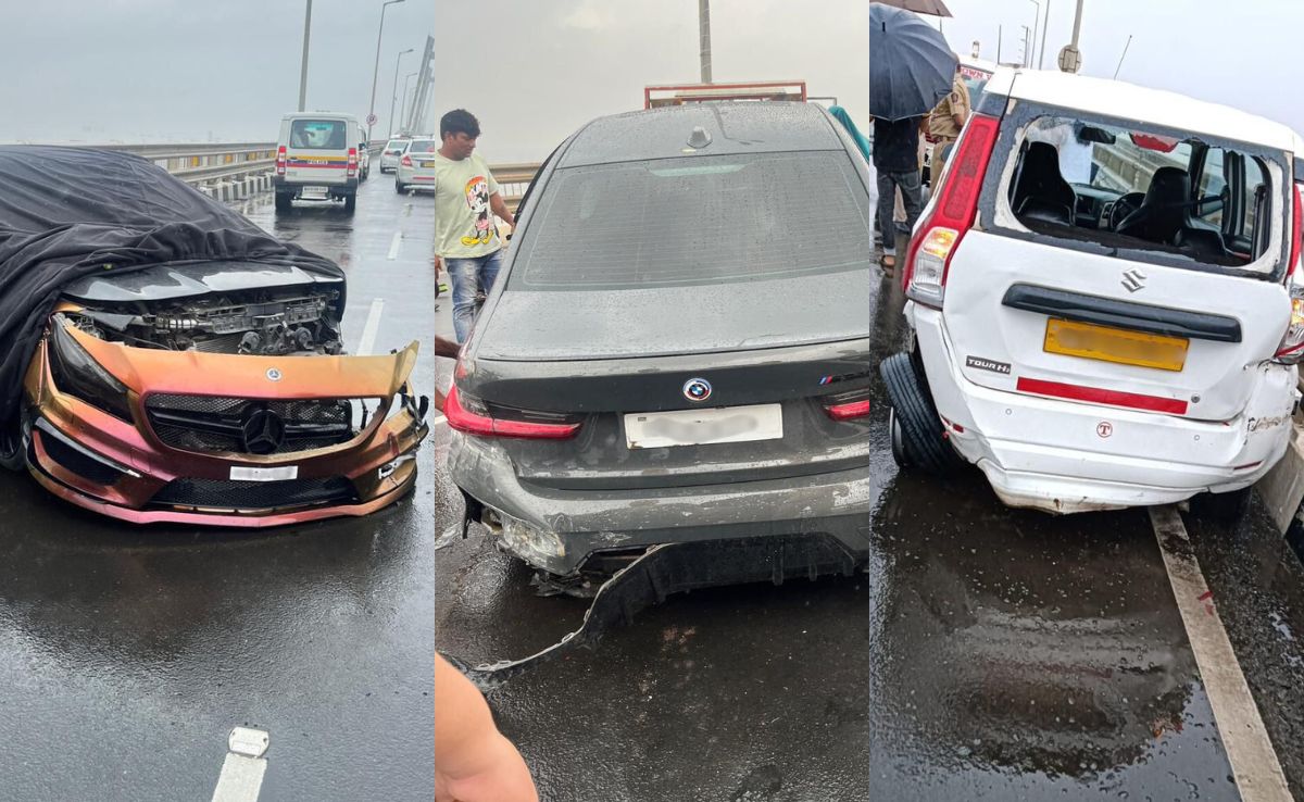 Two speeding luxury cars - a Mercedes and a BMW - crashed into a cab while allegedly racing on the Bandra-Worli sea link in Mumbai. The accident early Sunday morning led to a traffic jam on the fifth longest bridge in the country.