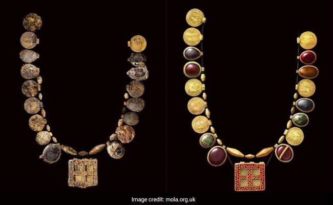 Archaeologists label it as a "once-in-a-lifetime" gold necklace dating back to 630-670 AD. It is also described as the richest of its type ever uncovered in Britain. At least 30 pendants and beads made of Roman coins, gold, garnets, glass and semi-precious stones are part of the jewellery that was discovered close to Northampton. The centrepiece of this necklace is a large rectangular pendant made of red garnets and gold with a cross motif. Experts think this piece, which is made of red garnets set in gold, was once only half of a hinged clasp before it was reused.