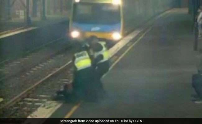 Dramatic CCTV footage shows a woman being pulled from the tracks moments before a train comes hurtling in to the station. The woman, who Australian media reports appeared to be drunk, was attempting to cross the train tracks at a suburban station in Melbourne late at night.
