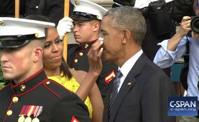 A video tweeted by CSPAN on August 2 shows FLOTUS wiping a little speck off the President's face and we cannot get over how adorable the two look.