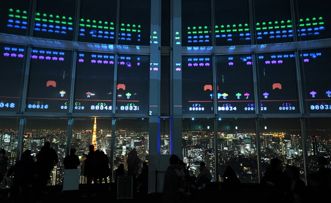 Block graphic aliens dropped down the window panes of a Tokyo skyscraper before being blasted into oblivion by enthusiastic gamers celebrating 40 years of the arcade sensation "Space Invaders".