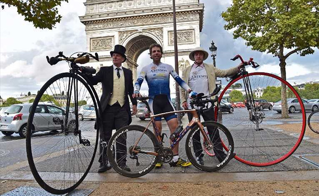 British cyclist Mark Beaumont poses next to men with penny-farthings after arriving in Paris (AFP)