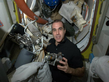 In this photo provided by NASA, astronaut Rick Mastracchio works to replace a pump in a spacesuit, Monday, April 14, 2014, aboard the International Space Station