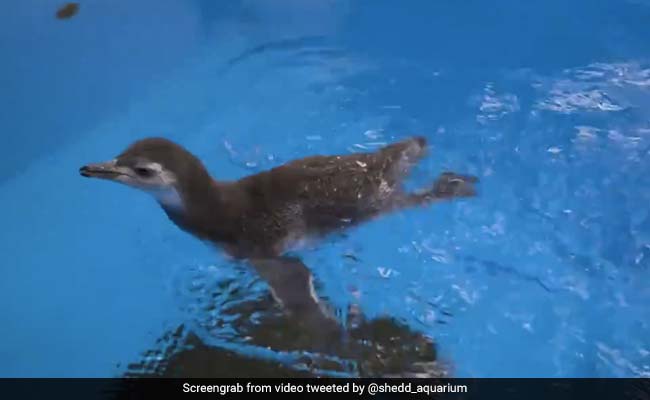 Four baby penguins crossed an important milestone at USA's Shedd Aquarium when they began swimming. The Chicago-based aquarium has shared a delightful video which shows the the penguin chicks taking their first plunge in water - and appearing to enjoy every minute of it.