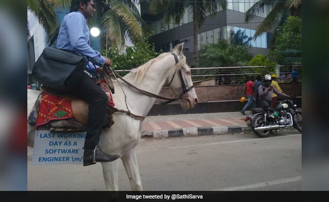 Most people try to make their last day of work memorable, but this Bengaluru techie has managed to make his last working day go viral. Social media is flooded with pictures of a software engineer riding a horse to work, dressed in formals with a laptop bag slung around his shoulder. Pictures show the techie sitting on a white horse with a placard that reads "Last Working Day As A Software Engineer" - and they're now circulating all over Twitter, Facebook and WhatsApp.