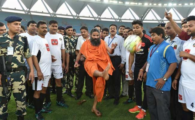 Baba Ramdev unsuccessfully tried to strike a goal quite a few times. (AFP Photo)