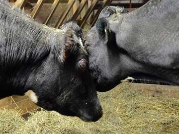 In this image on Feb. 5, 2014 provided by Farm Sanctuary shelter, blind cows Tricia, left, and Sweety get acquainted at the shelter in Watkins Glen, New York
