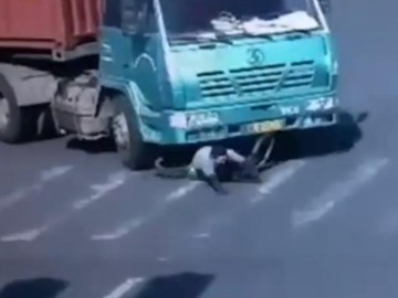 In what looks like nothing short of a Christmas miracle, this Chinese cyclist got run over by a 14-wheel truck that was turning a corner, and SURVIVED.
