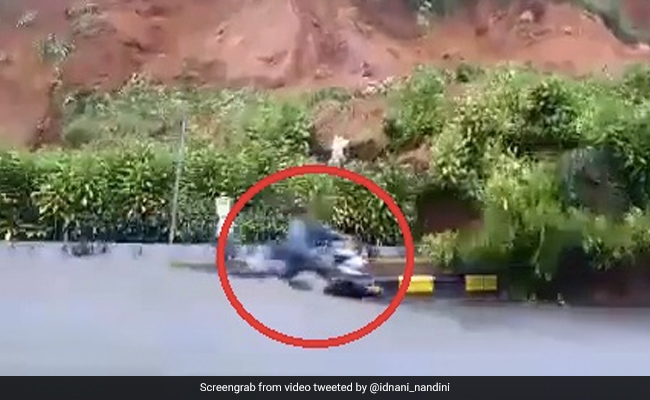 The video shows a man on a scooter managing to escape in the nick of time as a piece of elevated land caves in and falls on the road. The man was filmed abandoning his two-wheeler and rushing to safety to avoid getting buried under the land. His scooter, however, was seen getting completely buried under the avalanche of mud.
