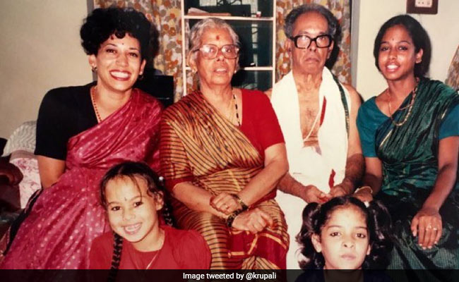 While Kamala Harris has rarely been seen in a saree, an old photograph that has being widely shared online does show her wearing one. The pic shows her on a couch with her grandparents, wearing a red saree.