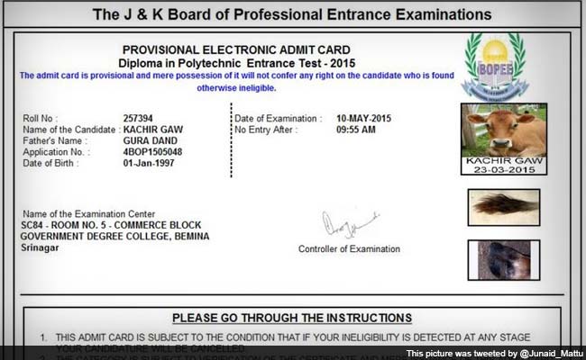 The incident came to light on Saturday after opposition National Conference spokesman Junaid Azim Mattu uploaded a copy of the admit card on Twitter. "The J&K Board of Professional Entrance Examinations issued this roll-number slip to a cow after due verification. I have both the Provisional Confirmation Page for applicant Ms 'Kachir Gaaw' as well as details of payment she made to BOPEE," Mattu tweeted.
