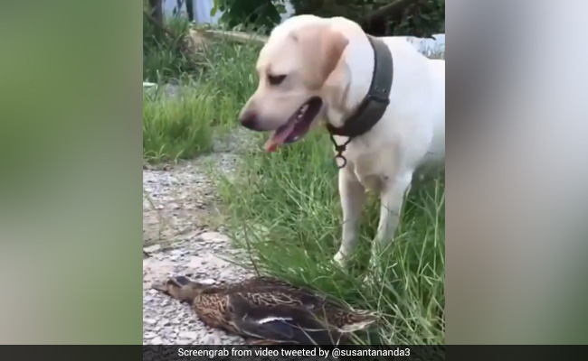 A duck has left the Internet impressed with its quick-thinking and craftiness. Confused? This video will make things clearer. Over the weekend, Indian Forest Services officer Susanta Nanda took to Twitter to share a hilarious video that shows a duck playing dead in front of a dog. In the short clip, the duck is seen lying on the ground, eyes closed, as a Labrador retriever towers over it. Displaying some serious presence of mind, the duck manages to lie absolutely still until the dog's attention is diverted. Then, as soon as the dog bounces away, it gets up in the flash of an eye and runs as fast as its short legs can carry it - gifting netizens a hilarious clip that has left them in stitches.