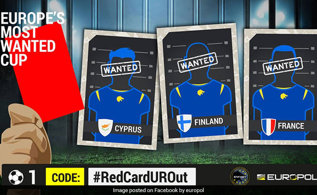 The e-cards read "WANTED" on the front plus an outline of the fugitive and which European country is looking for him, on the backdrop of a football pitch.