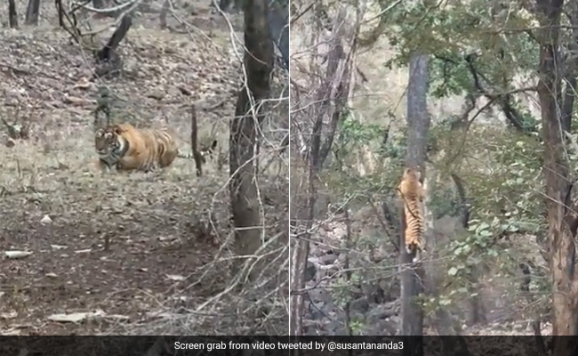 In the 30-second clip, a tiger can be seen getting ready to charge at a leopard. As it ran and sprinted towards the leopard, the latter quickly climbed a tall tree. Following the leopard, the tiger too climbed the tree but gave up after a few seconds.