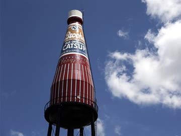 In this July 25, 2014 photo, a water tower in the shape of a ketchup bottle is seen in Collinsville, Ill.
