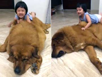 The video shows Simba sitting patiently as his tiny human sings to him. She climbs on him, pets his back, plays with his fur and even lays down on him but it's amazing how calm her canine playmate stays. In fact, he seems to be providing backup vocals for Weiwei by growling in sync with her song.
