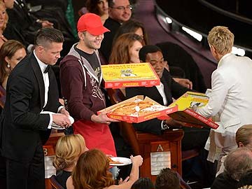 Brad Pitt, left, and Ellen DeGeneres, right, pass out pizza in the audience during the Oscars at the Dolby Theatre on Sunday, March 2, 2014, in Los Angeles