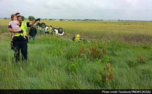 A Colorado policeman is being hailed a hero after a picture of him cradling a two-year-old girl at a car crash site went viral. The officer sang a nursery rhyme to distract the toddler from the crash that killed her father who was at the wheel.