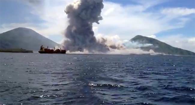 A video uploaded to YouTube shows a volcano erupting in Papua New Guinea, spewing out ash thousands of feet into the sky. Accompanied by the sound of boiling a fist-shaped bundle of ash and smoke pushes away clouds. "Watch out for the shot, it's coming," a man is heard saying, probably the one capturing all this action on a video.