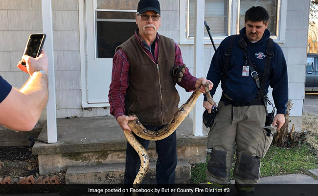 Luckily, the fire department's "resident snake charmer", Deputy Fire Chief Melvin Linot, was able to wrangle the snake from its hiding place. A picture shared by Butler County Fire District #3 shows Chief Linot and firefighter Brandon Kolter with the huge snake.