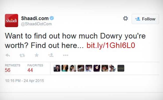 The tweet invites the user to find out how much dowry he, yes he, is worth. She can click too though on to a form where the options are not gender specific. Shaadi.com asks to record your age, profession, salary, education etc.