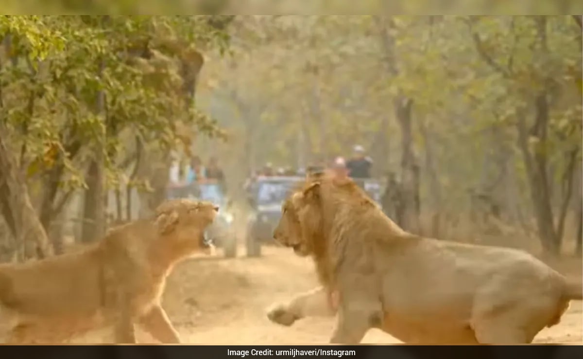 A rare and dramatic moment of wild behaviour has been captured at Gir National Park, where a lioness was seen boldly challenging a male lion. The intense encounter, now gaining attention online, shows that even the king of the jungle can be tested.