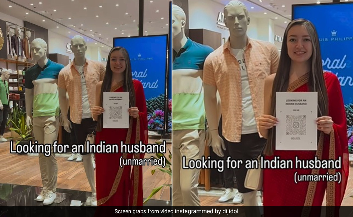 The influencer posed next to a male mannequin holding a poster that read, "Looking for an Indian husband (unmarried)." The poster also had the QR code of her Instagram profile printed on the paper.